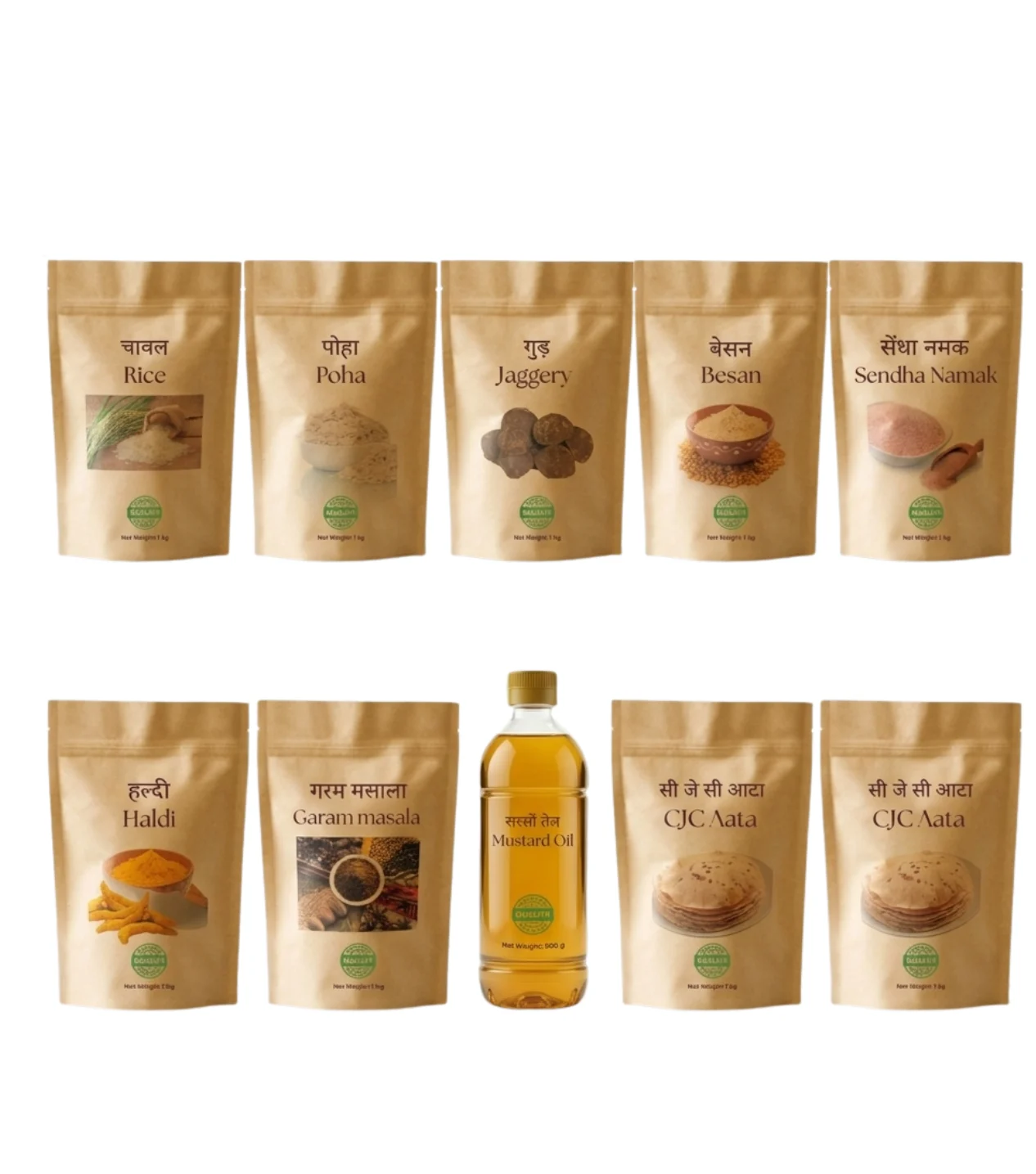 CJC Aata 1 kg x 2, Mustard Oil (Sarso tel) 1 kg, Garam Masala 100 g, Haldi 1kg, Sendha Namak 1 kg, Besan 1 kg, Jaggery (Gud) 1 kg, Poha 1 kg, Rice 1 kg.